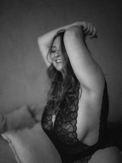 In your boudoir shoot, you don't have to "stand there", "sit pretty", "force a smile" "force a laugh", or "look happy" because someone tells you to. The shoot is your moment and you get to decide what kind of moment it is. Do you want to keep your hair open or up, as you always do in everyday life? Do you want to wear glasses because they are a part of you or do you want to try being in pictures without them? What kind of clothes do you want to wear, do you want to be naked, in underwear, or wrapped in your favorite sweater? What music plays in the background, in what venue you want to be photographed, whether you want the pictures to show joy or rather calmness or both — you decide.